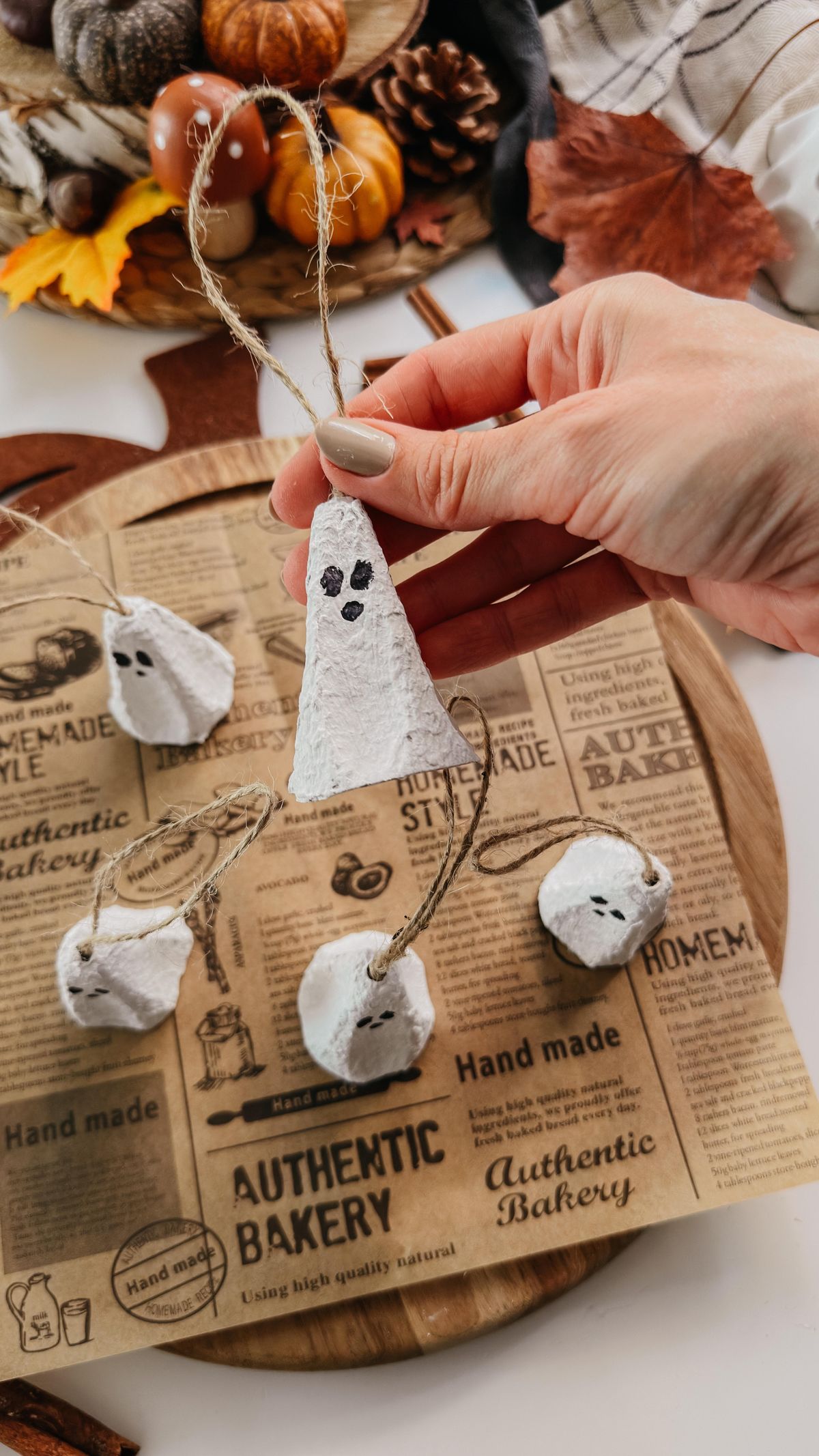 Jak na to? Odstřihněte z plata od vajec středové kužely, které už v sobě mají dírku. Nabarvěte je na bílo a počkejte, až barva zaschne. Poté nakreslete na bílý kužel oči a kulatou pusu. Na závěr provlékněte dírkou provázek tak, aby se vám vytvořilo očko. Uvnitř kužele udělejte uzlík. A je hotovo. Závěsný duch, který se hodí třeba na větvičky ve váze, je na světě.