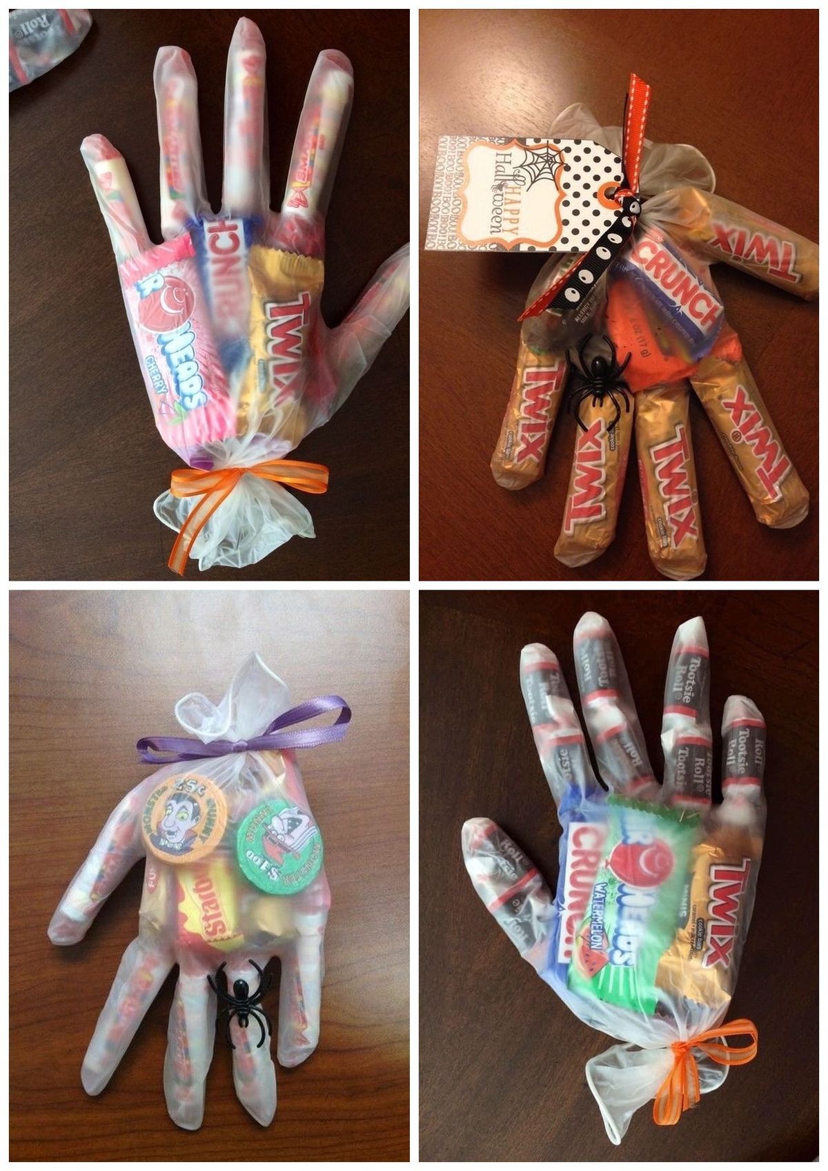 Koupené sladkosti a drobnosti nasypte do latexových rukavic a zavažte oranžovou a černou stuhou. Na rukavici můžete ještě nalepit třeba gumové pavouky, nebo obarvit konečky prstů červenou barvou, aby vypadaly jako krvavé.
