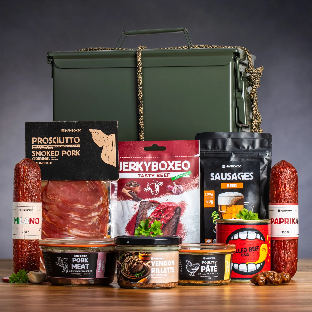 Uvnitř této plechové krásky na Vás čekají šťavnaté masové lahůdky, které rozzáří chuťové pohárky i toho nejnáročnějšího gurmána. Najdete tu lahodné paštiky, křehké trhané maso i výborné klobásky — vše připravené s láskou a poctivostí, jako by to dělala maminka. Připravte se na pořádnou dávku chutí, která Vám rozproudí krev v žilách!