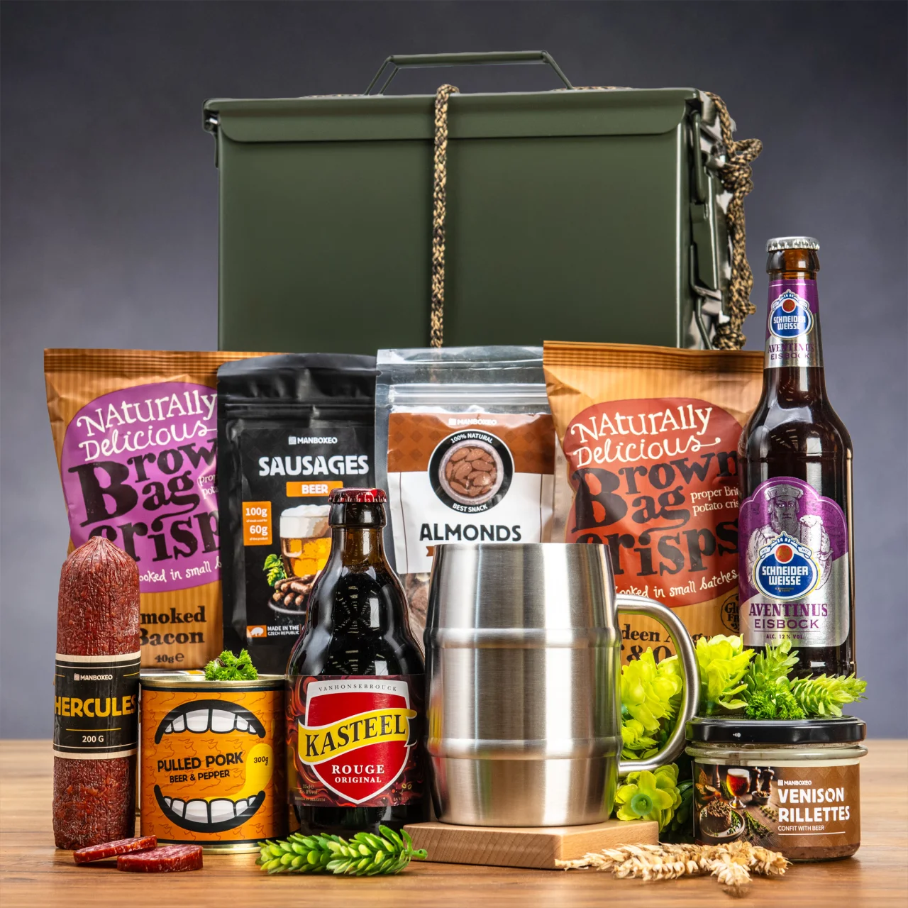 Otevřít tuhle muniční bednu možná obdarovaného stálo dost sil, ale teď je zaručeně snadno a rychle získá zase zpět! Jakmile odklopí víko, spatří něco, o čem se mu ani nesnilo. Vybrané pivní speciály, masové pochoutky, které ocení všechny chuťové pohárky a náš dokonalý chladicí půllitr. Po tomhle touží každý pivař!