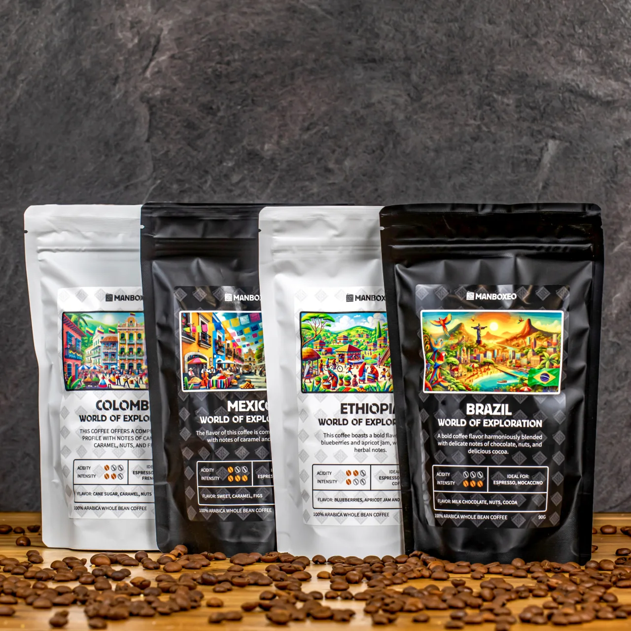 Colombia (90g) - 100% ARABICA - Každé zrnko v tomto balíčku ztělesňuje pravou esenci kolumbijské kávy. Vynikající kávová směs nabízí sladké tóny hnědého cukru, karamelu a ořechů, doplněné citrusovou svěžestí. Tato káva je pěstována v nadmořských výškách mezi 1 200 a 2 000 metry a představuje vrchol odbornosti kolumbijských farmářů. ACIDITA:1 INTENZITA:2