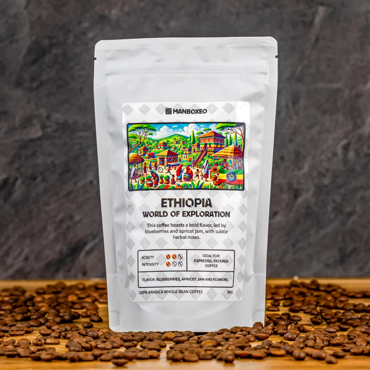 Etiopie 100 % arabica, zrnková káva s výraznou chutí, které vévodí borůvky a sladký džem s tóny citrusů. Nízká intenzita, nízká acidita. Ideální na espresso a moka. Hmotnost: 90 g.