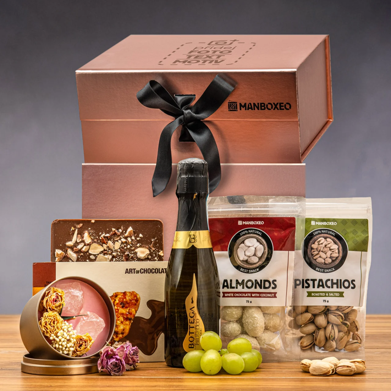 Jakmile se oslavenkyně dostane dovnitř, nebude vědět, co dřív ochutnat. A není se čemu divit! Luxusní prosecco jsme doplnili vybranými slanými i sladkými lahůdkami. A přidali ještě voňavou svíčku pro vytvoření té pravé atmosféry.