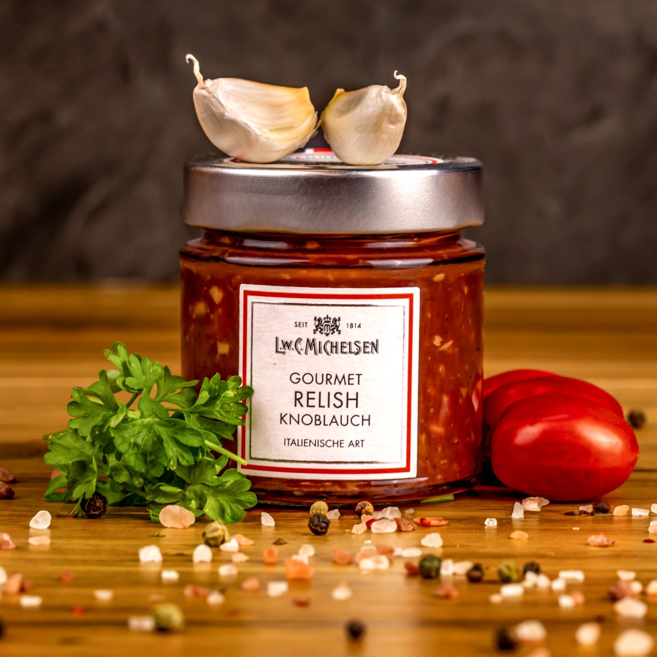 Gurmánské česnekové relish s rajčaty a kořením 215g - Dokonalá pochoutka s česnekem, rajčaty a kořením, která se hodí jako doplněk téměř ke každému jídlu. Originální italský recept vás a vaše chuťové pohárky zaručeně odzbrojí.