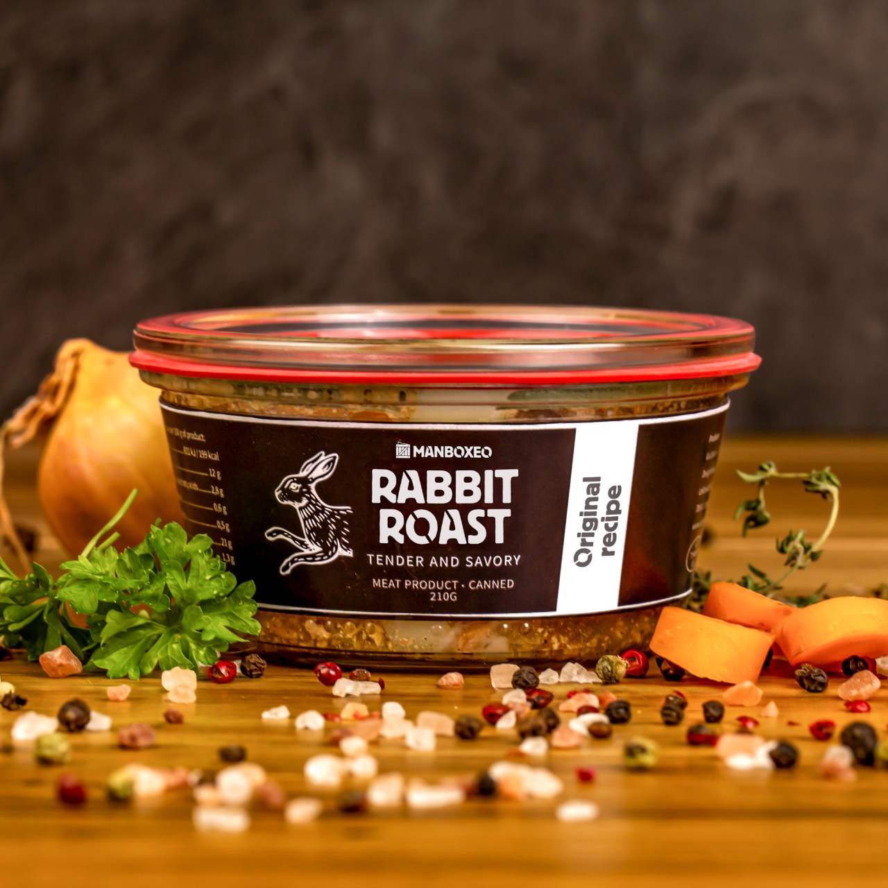 Pečený králík s vepřovým bůčkem – perfektně dochucené kousky králíka a vepřového bůčku, naložené ve voňavém koření a upečené dozlatova společně s cibulkou a s kořenovou zeleninou. Vhodné i pro bezlepkáře. Mňami.