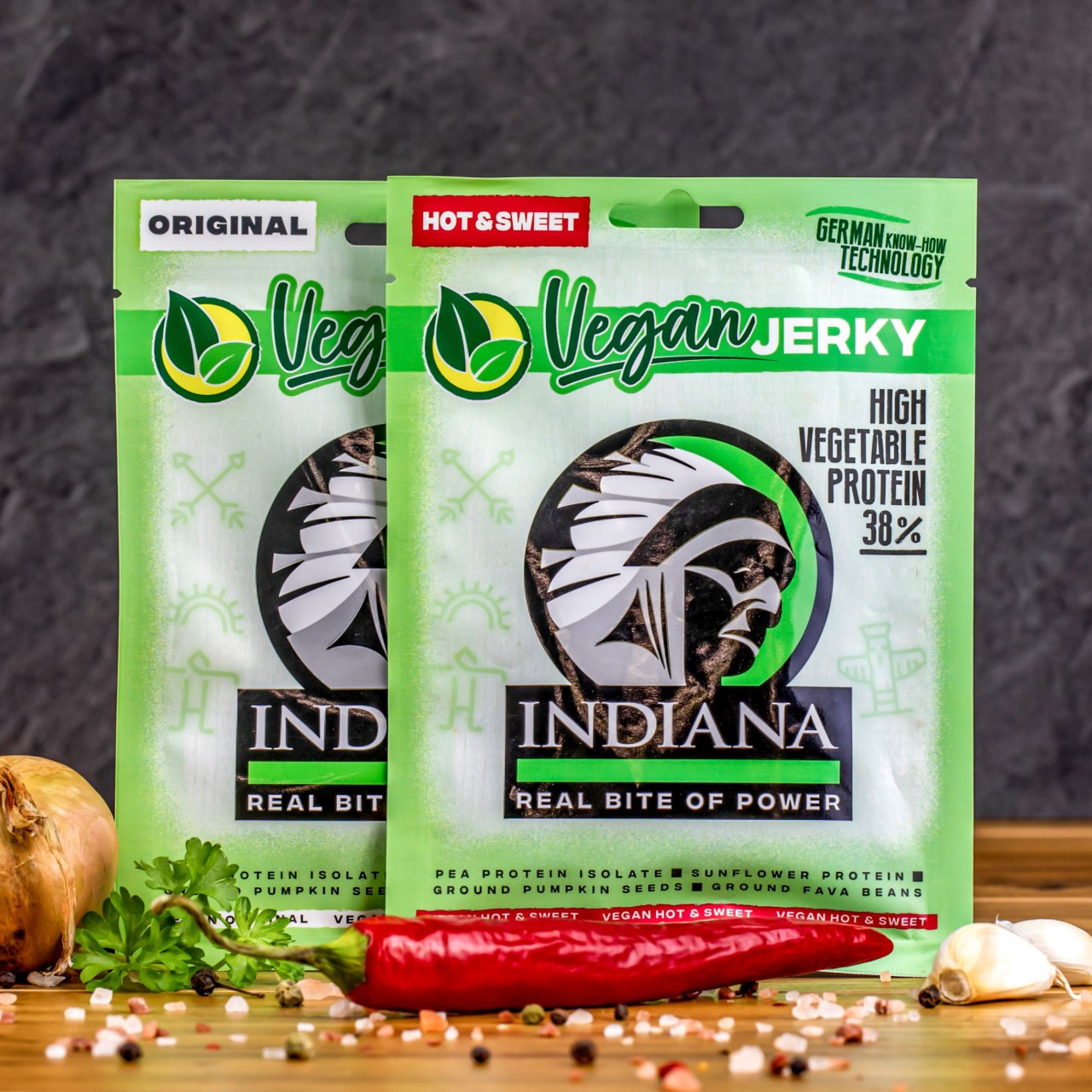 Vegan Jerky Hot&Sweet 25 g Indiana - Masu nefandíte, ale nějaká alternativa sušeného masa by vám bodla? Vyzkoušejte naši veganskou variantu. Díky praktickému balení je to dokonalá sváča do kapsy.