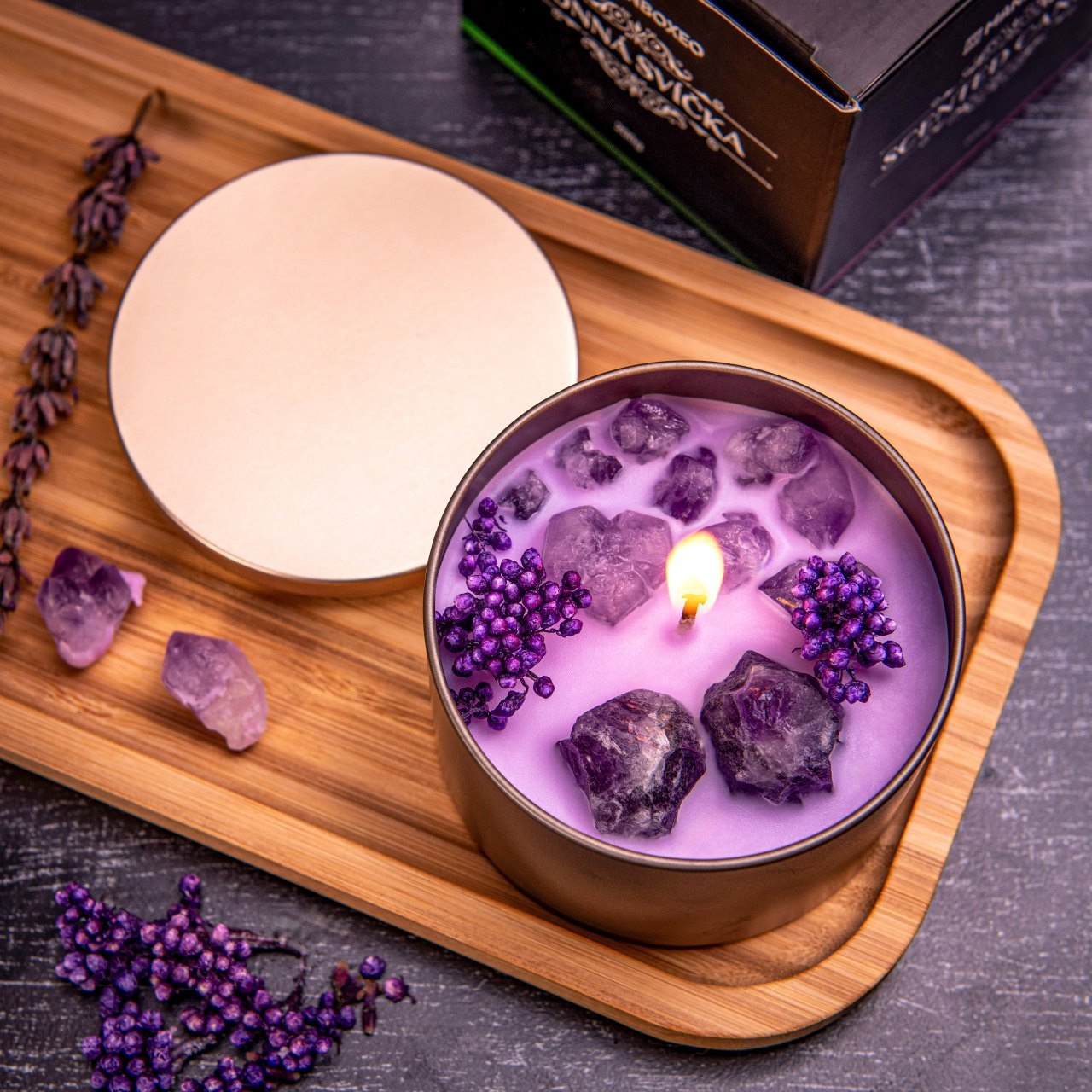 Plechová VONNÁ SVÍČKA v krabičce 200g - LAVENDER - Tahle svíčka je 2v1. Kromě toho, že naplní domov vřelým světlem a božskou vůní ještě navíc ozdobí každý interiér. Součástí sójové svíčky s intenzivní přírodní vůní levandule jsou fialové kamínky, které se při hoření budou krásně třpytit.