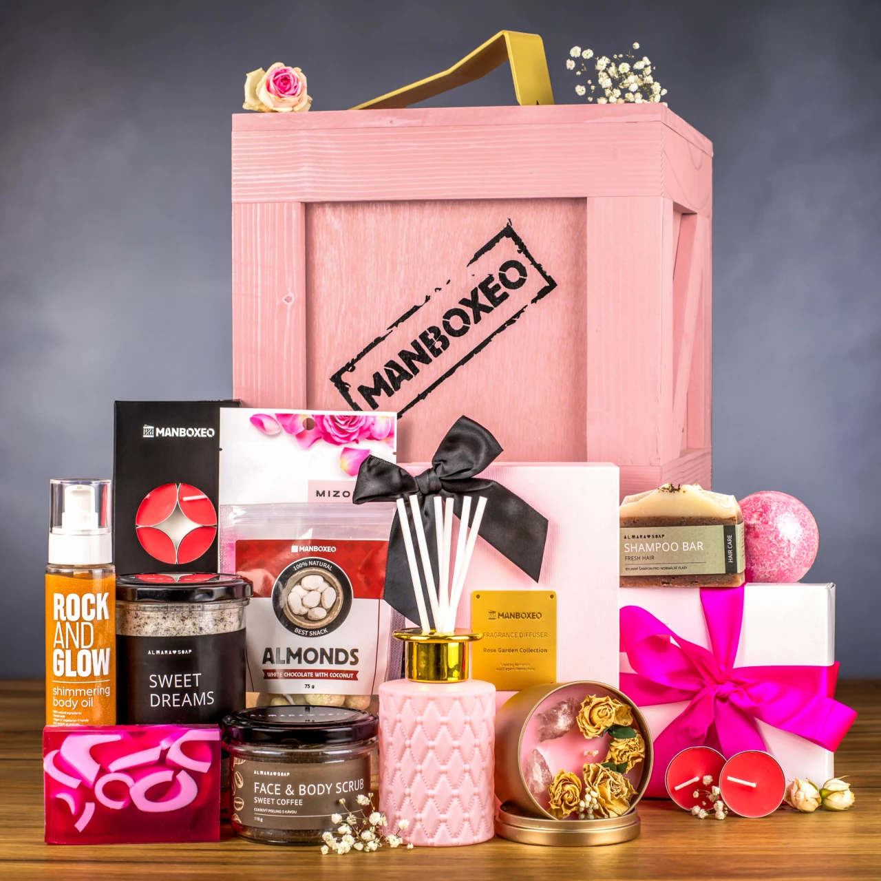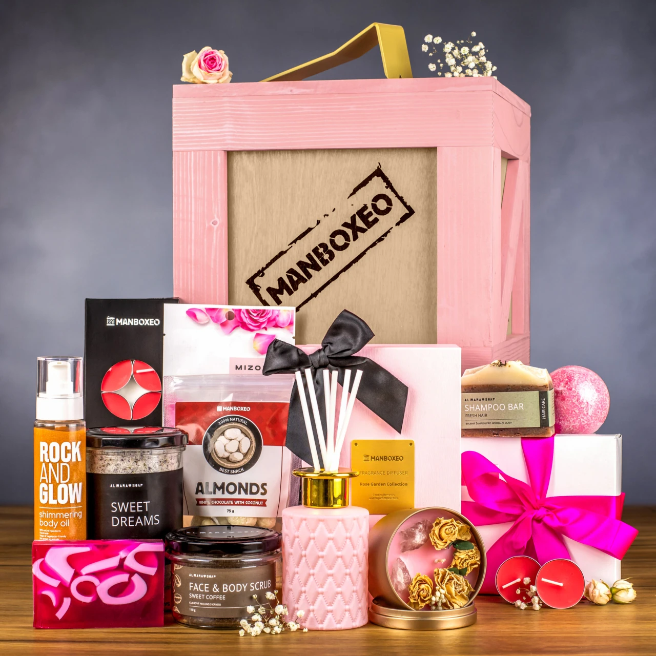 Dostala se obdarovaná dovnitř? Gratulujeme! Bedna je až po víko napěchovaná voňavými a jedlými dárky. Lahev kvalitního prosecca jsme doplnili luxusní kosmetikou, vonnými svíčkami a sladkou tečkou, které společně vytvoří dokonalý relaxační zážitek. Zkrátka wellness v pohodlí domova. A to chcete. Odteď už se mezi ženu a bednu nestavte, mohli byste přijít k úhoně!