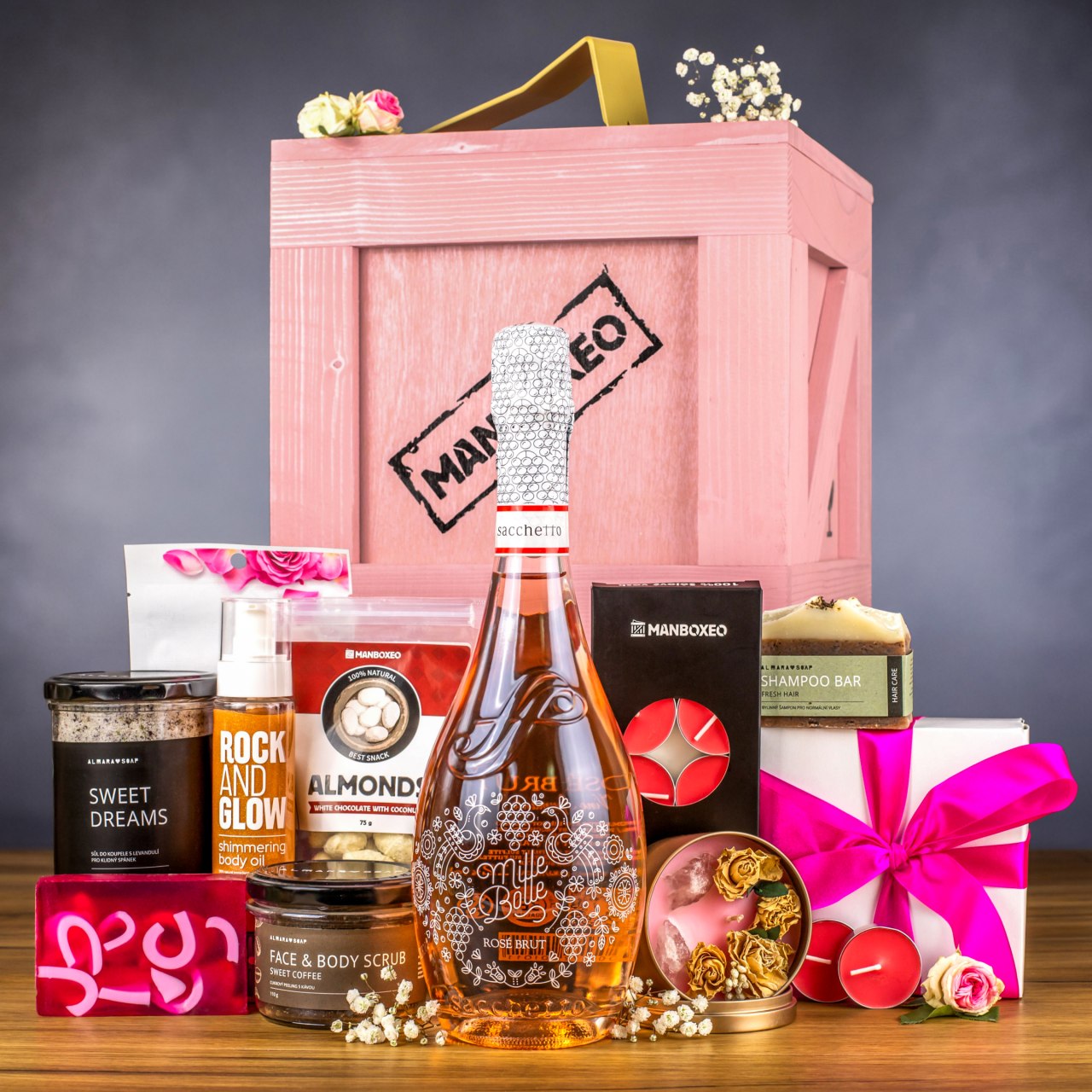 Dostala se obdarovaná dovnitř? Gratulujeme! Bedna je až po víko napěchovaná voňavými a jedlými dárky. Lahev kvalitního prosecca jsme doplnili luxusní kosmetikou, vonnými svíčkami a sladkou tečkou, které společně vytvoří dokonalý relaxační zážitek. Zkrátka wellness v pohodlí domova. A to chcete. Odteď už se mezi ženu a bednu nestavte, mohli byste přijít k úhoně!