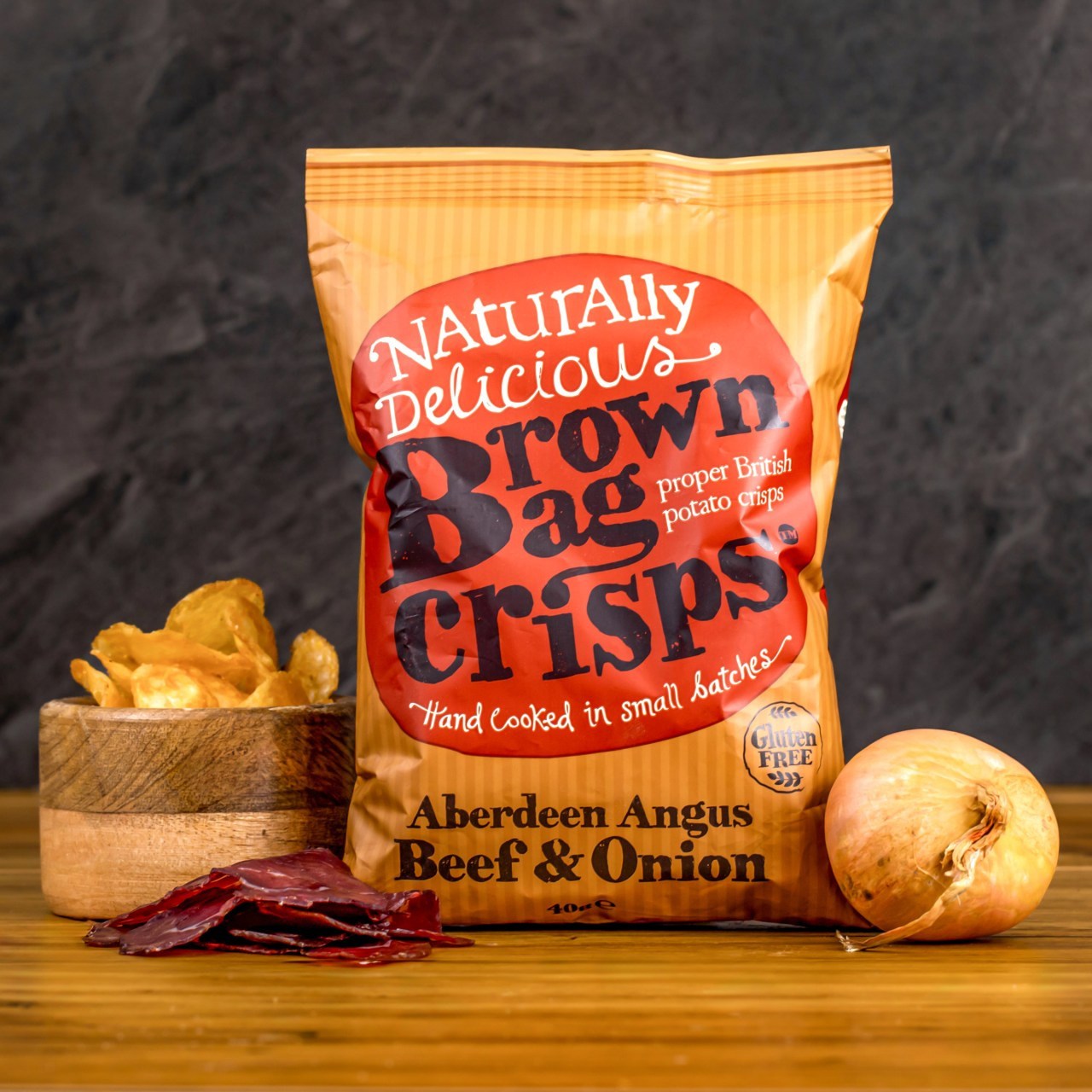 Brown Bag Crisps - Beef & Onion 40 g - Láska na první ochutnání, to dokonale vystihuje tuto kvalitní a jedinečnou pochoutku. Spojení hovězího a cibule vás vystřelí z bačkor jakmile ochutnáte byť jen drobeček. Lepek v nich nehledejte.