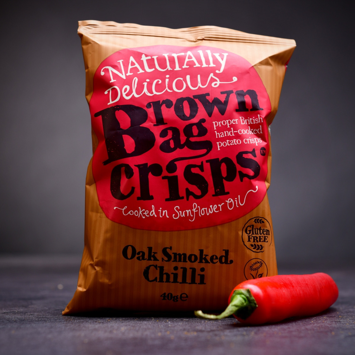Brambůrky Brown Bag Crisps - uzené chilli 40 g — Křupavý element nesmí chybět. Ručně vyráběné chipsy vyladěné v Anglii k dokonalosti výrazným kouřovým aromatem doplněným špetkou prášku z chilli papričky Scotch Bonnet jsou to pravé pálivé. Všechny ingredience jsou 100% přírodní.