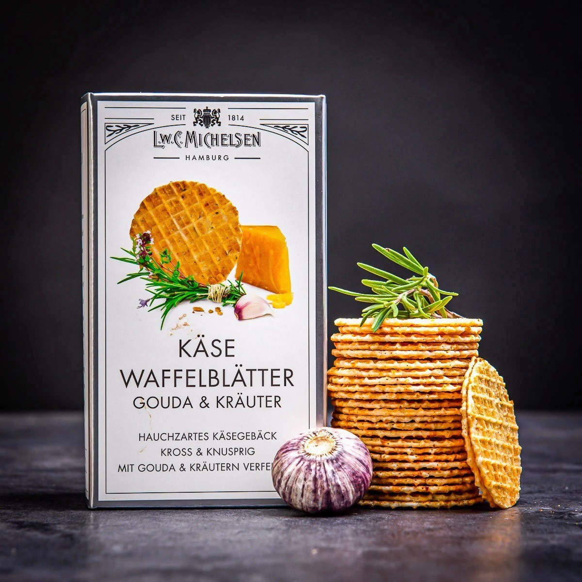 Sýrové vaflové sušenky s bylinkami 100 g – křehké, tenké vaflové sušenky s bylinkami jsou výborným společníkem k vínu. Dostanou vás svou intenzivní chutí, která je doplněná jemně aromatickými bylinkami s nádechem česneku.