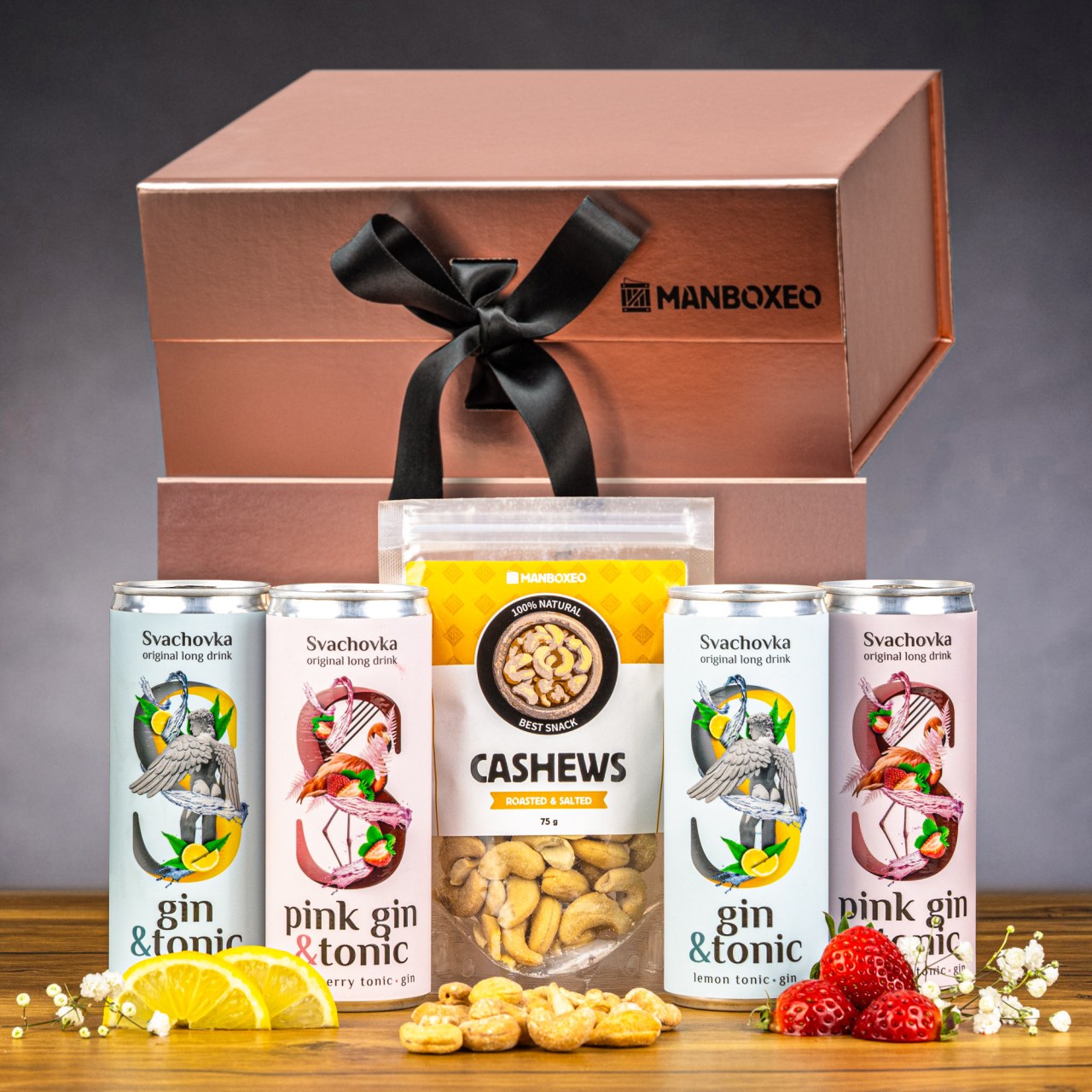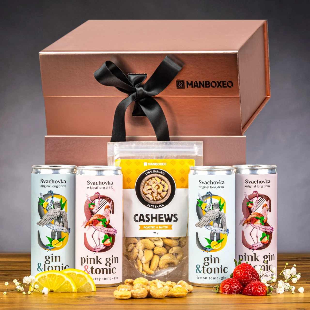 Valentýnská romantika bez klišé. Gin tonic, oříšky a klid na druhou. Elegantní box, na který můžete přidat i zamilovaný vzkaz a nechat ho mluvit za vás. A až bude vypito? Skvěle poslouží na svíčky, vůně do bytu nebo další drobnosti, které chcete mít po ruce.