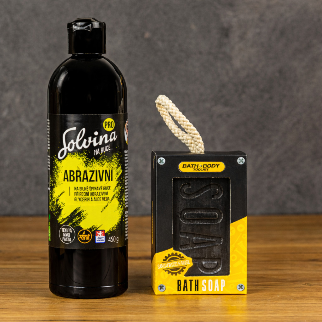 MÝDLO 200g BATH and BODY TOOLKIT — Skvělý pomocník na umytí rukou i celého těla. Účinně odstraňuje špínu a mastnotu a voní po santalovém dřevě. Navíc má praktický provázek k zavěšení do sprchy nebo k umyvadlu.