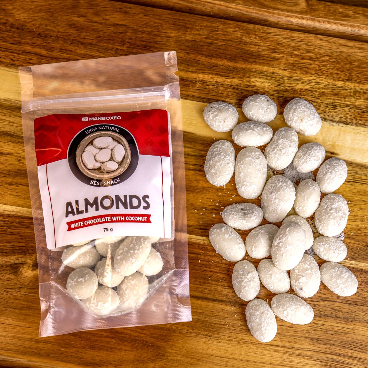 Mandle Bílá čokoláda & Kokos 75g — Olala! Tahle lahodná klasika nikdy nezklame. Křupavé mandle vykoupané v bílé čokoládě posypané kokosem jsou učiněná chuťová slast.