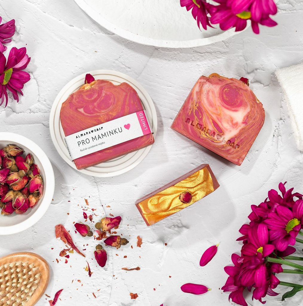 Almara mýdlo pro maminku - Mýdlo v růžovo-zlatém provedení doplněné o sušené růžové poupátko zaujme na první pohled. Sladká vůně růžového džemu působí jemně, čistě a příjemně.