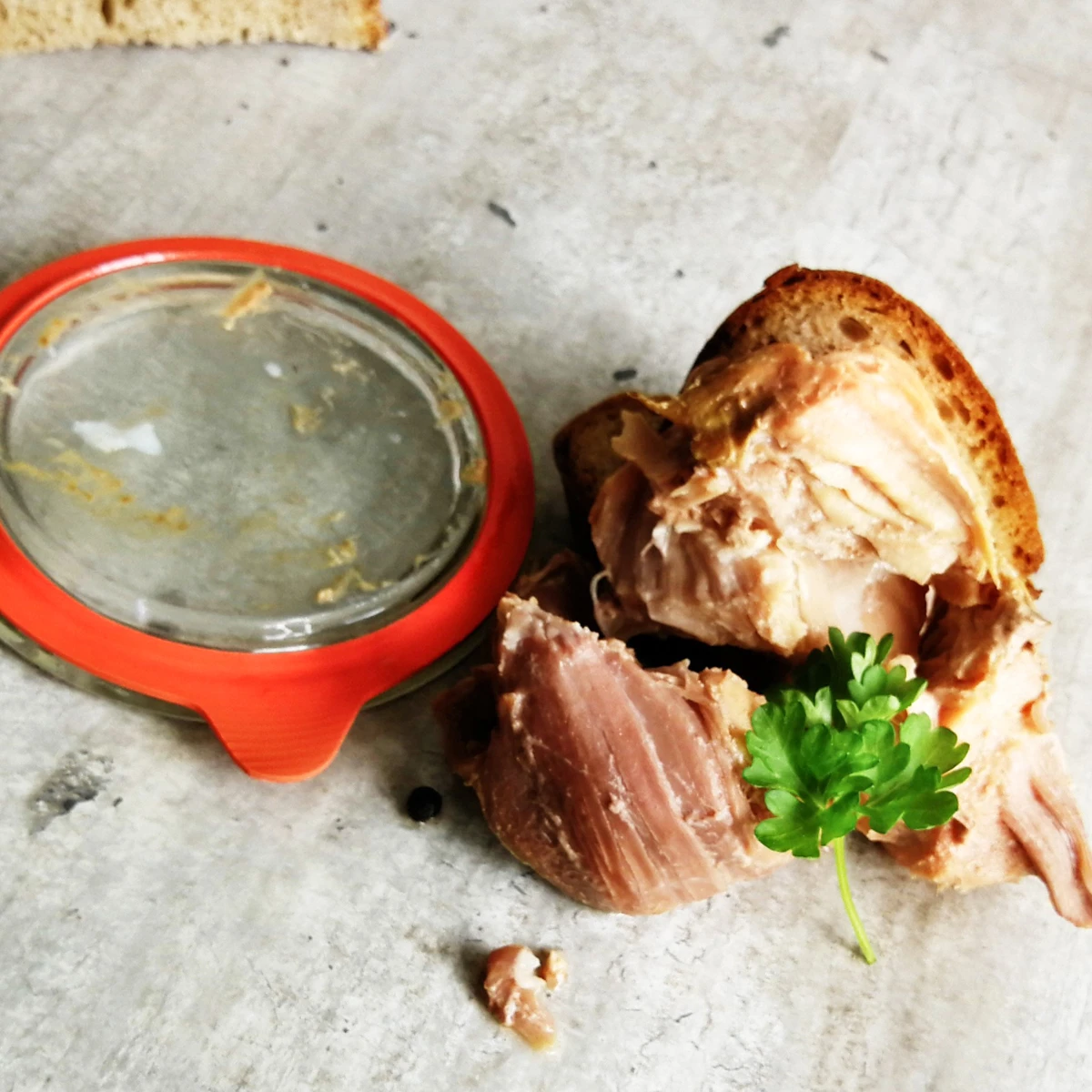 Vepřové maso ve skutečně vlastní šťávě – zkrátka Vepřovka jak má být – z 99% kvalitního vepřové masa – pouze nemleté vepřové maso a špetka soli. Bez přidané vody, pouze šťáva z masa. Bez lepku.