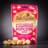 Luxusní malinový popcorn Joe & Seph's obalený v bílé čokoládě 63 g – každá kulička popcornu je ručně obalená v malinové polevě a pečlivě umístěná do košíčků z vysoce kvalitní bílé čokolády.