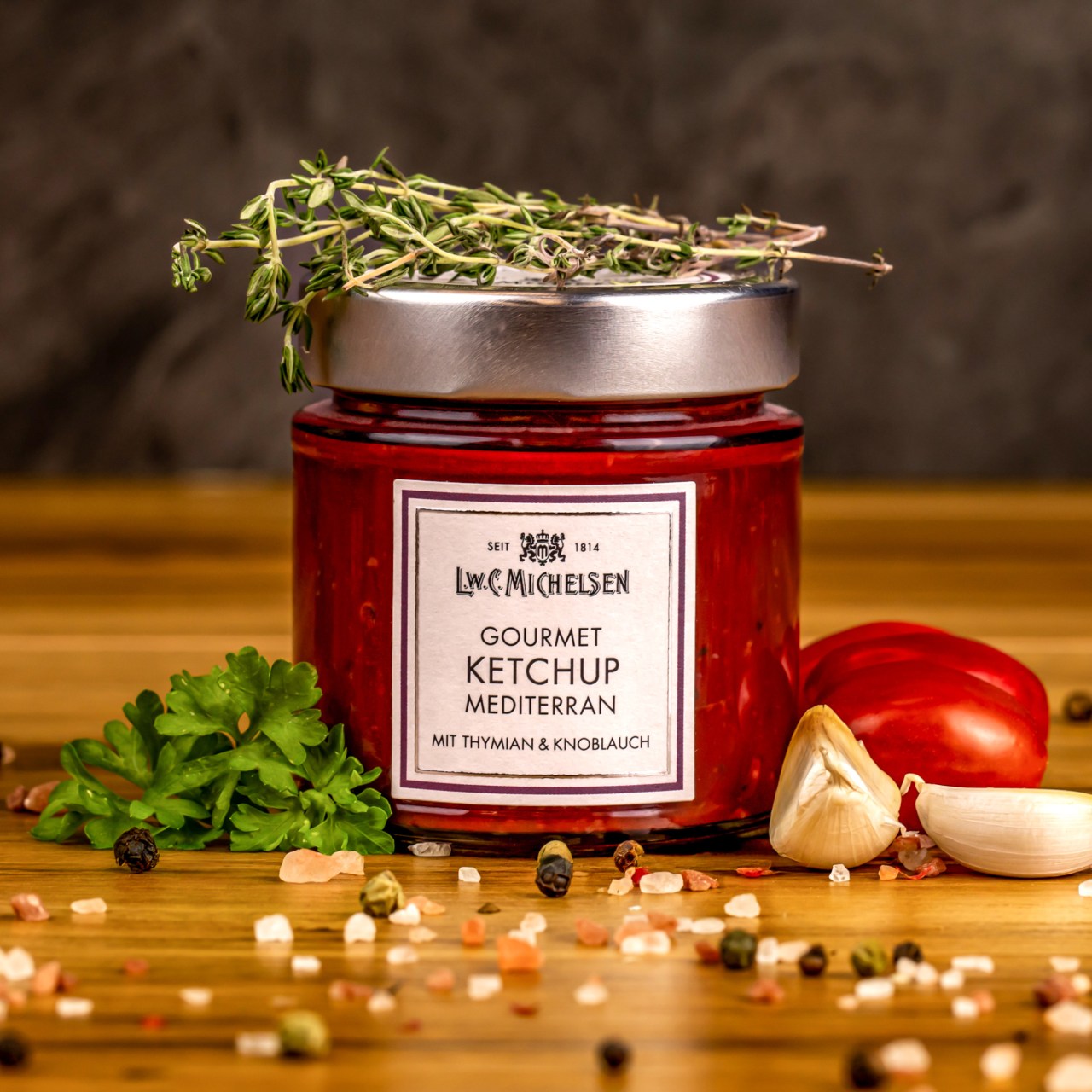 Kečup se středomořskou příchutí, tymiánem a česnekem - Kvalitní, lahodný kečup se středomořskou příchutí, vyšperkovaný tymiánem a česnekem vám dostane do kolen svou nezaměnitelnou chutí. Skvěle se hodí ke grilovaným pokrmům, těstovinám nebo jako dip.